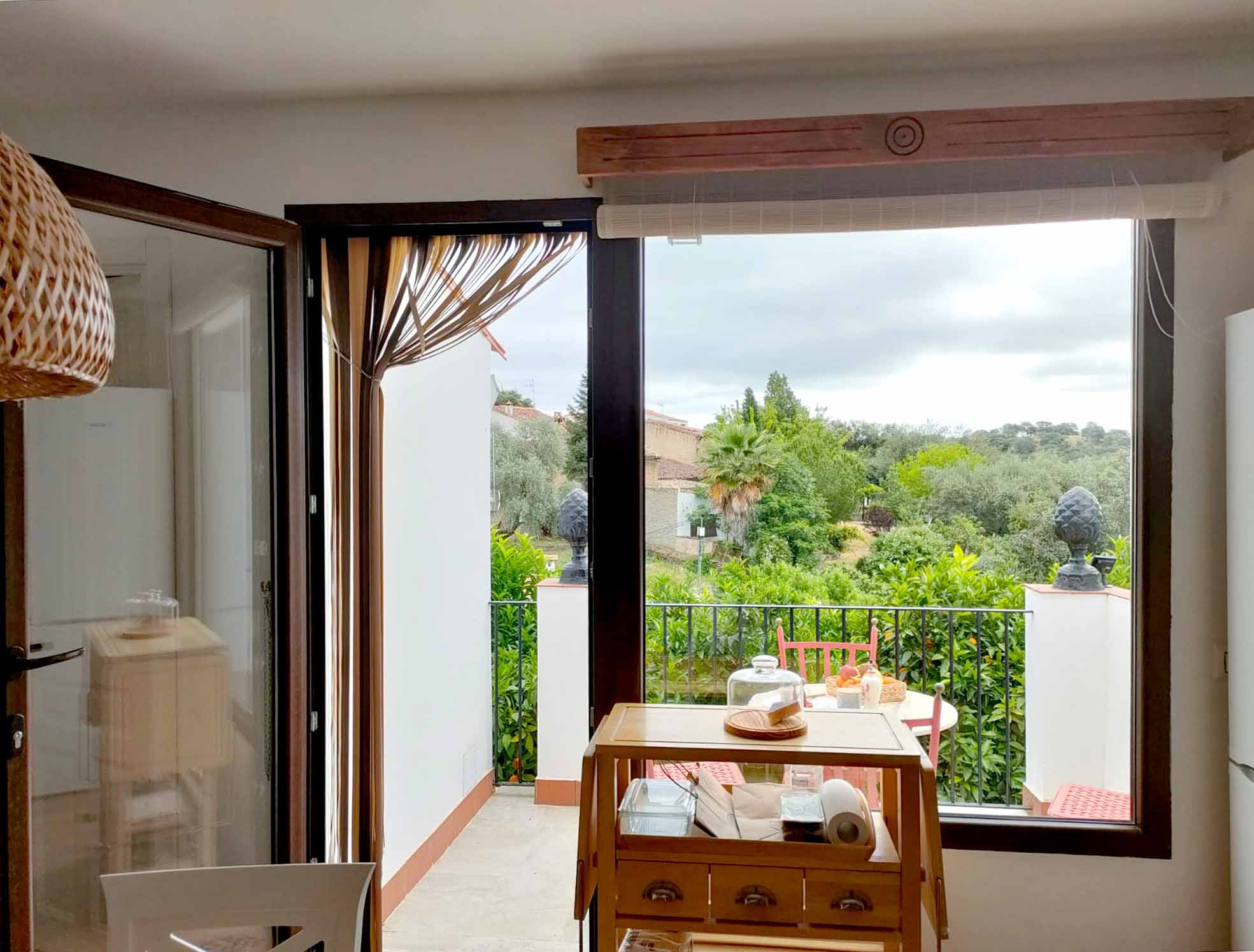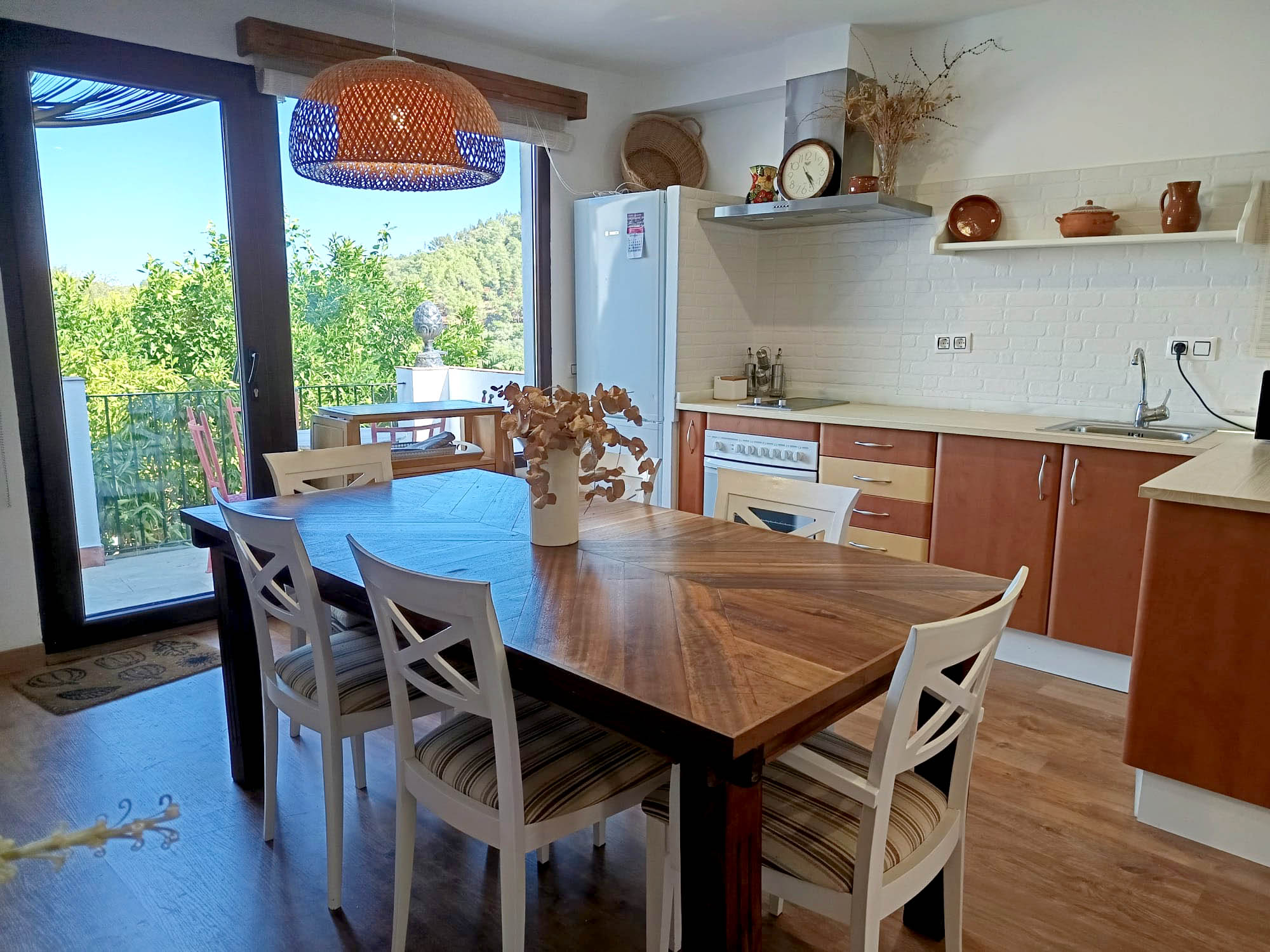 Desde la cocina se sale a una terraza con maravillosas vistas, es un sitio perfecto para desayunar contemplando el amanecer entre las montañas.